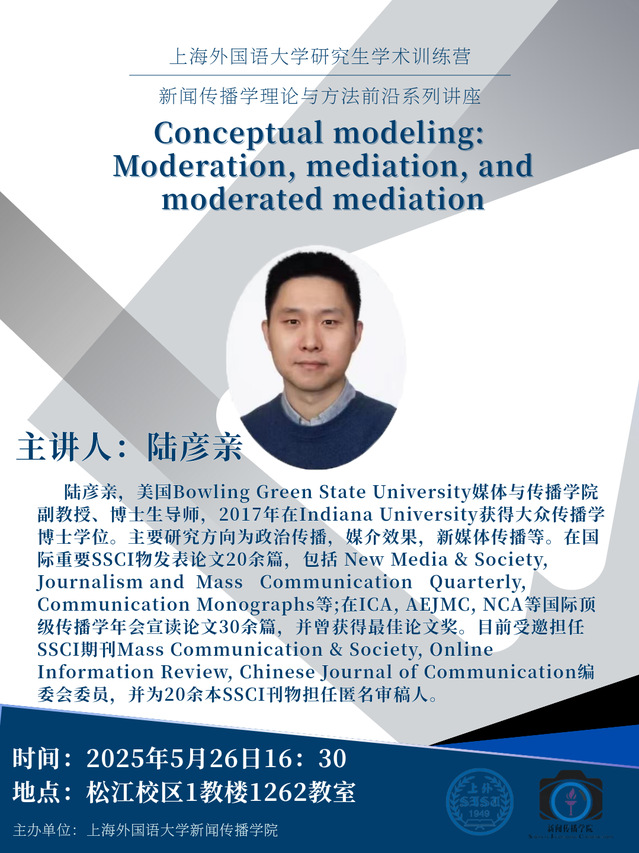 主讲人: 陆彦亲,美国Bowling Green State University媒体与传播学院副教授、博士生导师,2017年在Indiana Universitv获得大众传播学博士学位。主要研究方向为政治传播,媒介效果,新媒体传播等。在国际重要SSCI物发表论文20余篇,包括 New Media & SocietyJournalism and Mass Communication Ouarterly, Communication Monographs等; 在ICA,AEJMC,NCA等国际顶级传播学年会宣读论文30余篇,并曾获得最佳论文奖。目前受邀担任SSCI期刊Mass Communication & Society, OnlineInformation Review, Chinese Journal of Communication编委会委员,并为20余本SSCI刊物担任匿名审稿人。