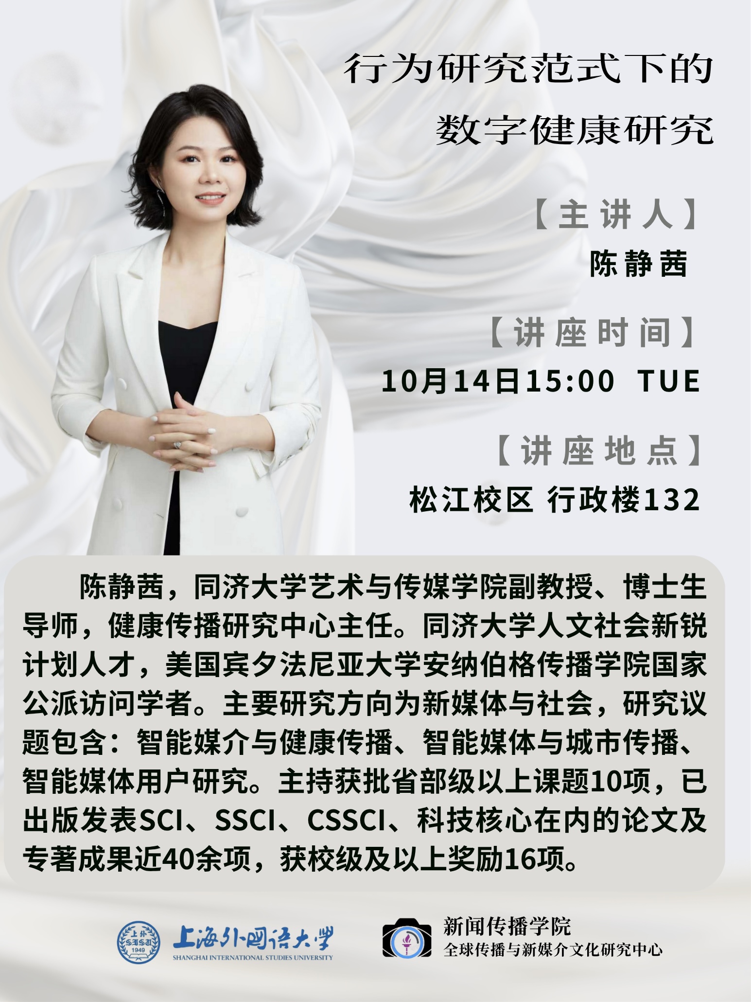 讲座内容:本讲座将对国际健康传播研究的缘起进行概要介绍,结合中国智能媒介的发展,以癌症患者和女性群体为例,介绍了在中国社会情境下开展数字健康研究的基本主张和创新路径。