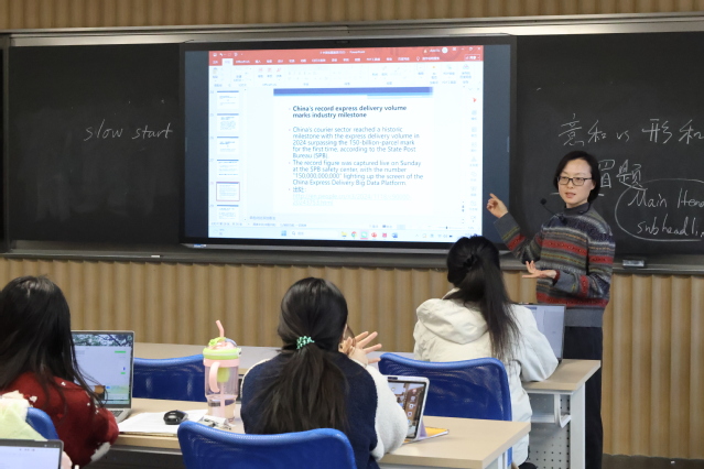 刘佳老师的《中英新闻标题差异比较》课程,通过近期“全运会”的新闻实例引出中英新闻标题的差异,继而从标题长度、细节、句式、修辞等多个维度对二者进行了全面细致的比较。在讲解知识点的基础上,刘佳老师进一步开展多项中英标题转换练习,通过实践与互动,帮助同学们把握语言表达的差异,实现准确转化与灵活创新。授课中,她特别强调了新闻写作的“受众意识”,提示同学们主动思考海外受众的知识背景与议题关注,培养国际视野与跨文化交流能力,以全球可理解的方式讲好中国故事、传播中国声音。