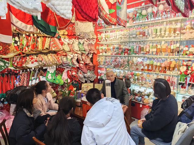 在浓厚的圣诞氛围中,组员们与蔡会长深入对话,摸清了圣诞商品从设计、生产到走向世界的全流程。随后,在刘佳老师的指导帮助下,小组继续走访街区商户,不仅收集到详实的市场与外贸信息,更听到了许多商户们攻坚克难、拓展海外市场的鲜活故事。