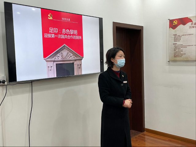 首先,讲解员给大家介绍了中共三大后中央局机关三曾里的历史故事,“春申江畔话中兴,西望长庚东启明”这两句诗描写的就是三曾里。三曾里是一幢很普通的石库门民居,外人路过也不会对它特别注意,然而在当时,它却是中国共产党革命斗争和革命事业的领导中心。1923年11月24日至25日是三曾里的高光时刻,中央执行委员会的一次重要会议在这里召开,会议讨论并通过了《国民运动进行计划决议案》,阐明了共产党员在国民党中的地位和作用,为第一次国共合作做了组织上思想上的准备。在一个个小故事中,同学们看到了初期共产党员艰苦朴素、纪律严明的精神面貌,感受到了共产党人地下工作的艰辛,对入党誓词有了更深刻的领会。
