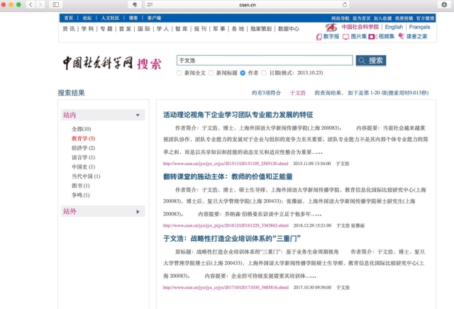 截止目前,于文浩博士已有3篇论文被中国社会科学网全文转载,4篇论文被人大复印资料《中小学教育》、《成人教育学刊》等全文转载。