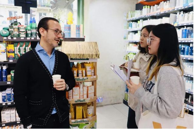上午10点,报道团分成三组,深入巴黎的药妆店市场,采访巴黎人对于“美”的理解与个人表达实践。其中,张春雨老师、孙羽婷、金奕伶和董嘉骐对药妆店Pharmacie Rivoli的店主进行了专访,了解该店如何采用意大利风格进行特色化经营。其他两组也分别探访了巴黎市区七家药妆店,与店员和顾客了解护肤相关的畅销产品、巴黎人的护肤理念和审美代际传承等方面的看法与经历。通过访问与观察,报道团了解到,巴黎人普遍注重自然健康的审美观和护肤理念。