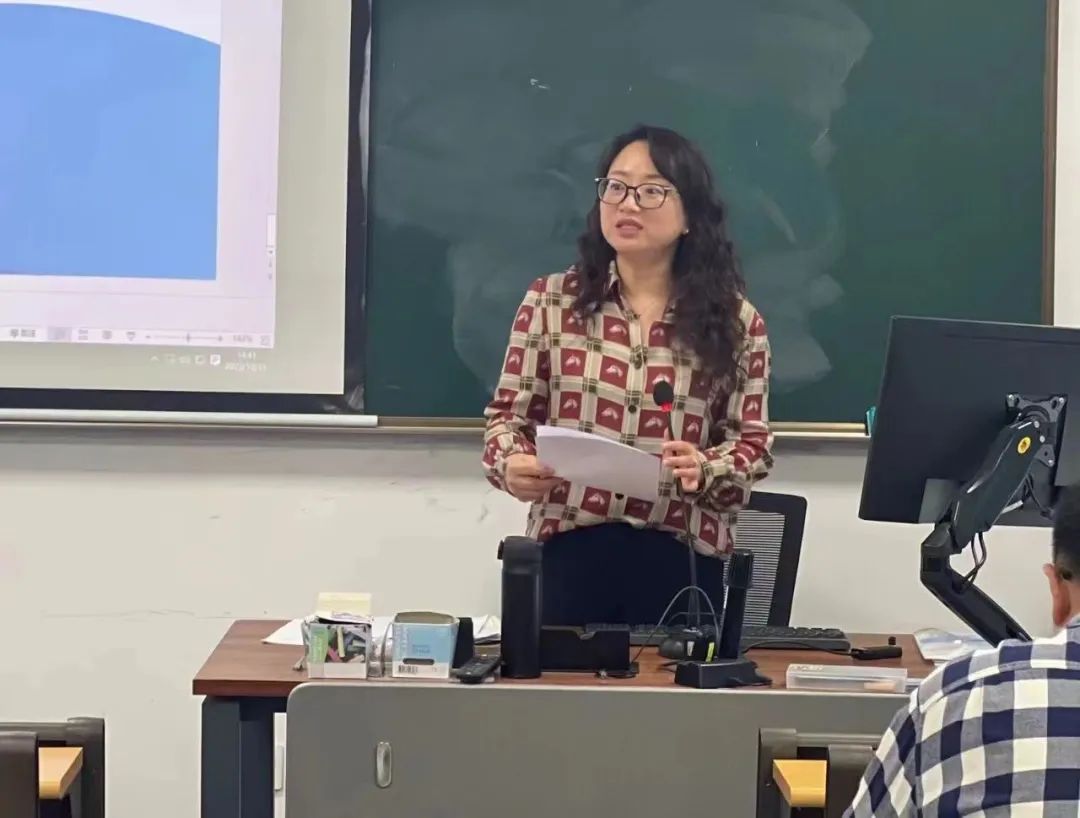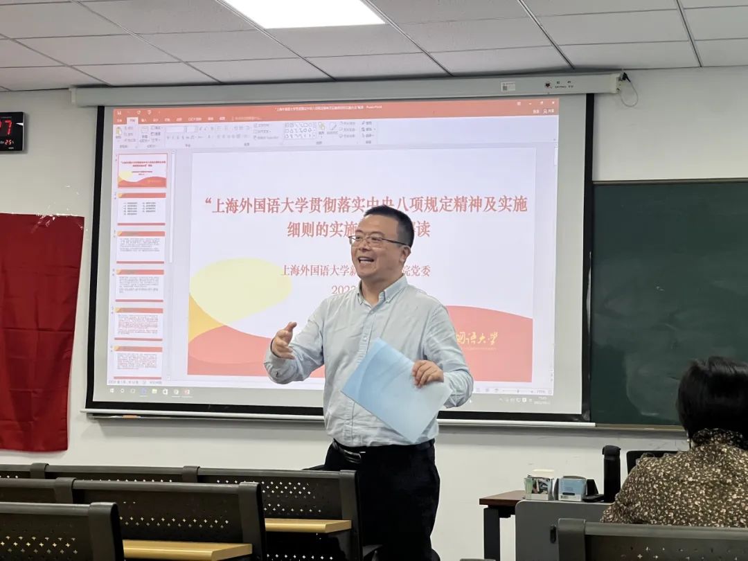 随后,樊娟向学院全体教工解读了《上外贯彻落实中央八项规定精神及实施细则的实施办法》。她从改进调查研究、密切联系群众、精简会议活动、精简文件简报等8个方面出发,对这一文件做出了全面深刻的阐释。