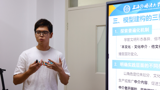 在论文发表分享环节,2022级硕士研究生黄泓晟以《中华优秀传统文化国际传播的“文化中介”模型构建——基于<论语>走向世界的研究》为题,介绍了自己的研究成果。论文提出了一个包括中介者、中介活动、中介介质和中介精神“四位一体”的“文化中介”模型。该模型为解决中华优秀传统文化国际传播中的瓶颈与挑战,推动中华文化更好地走向世界提供了参考和启发。