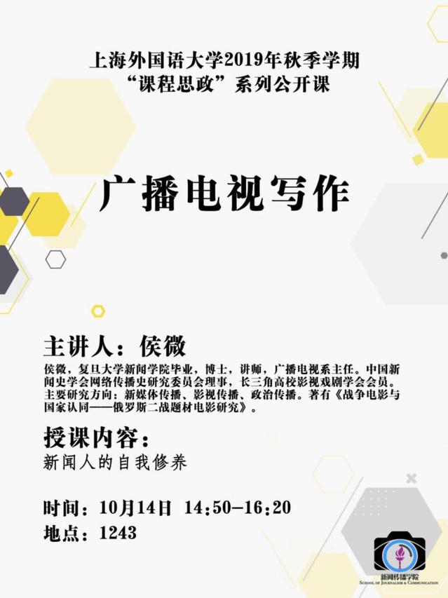 此次《广播电视写作》课是yL23411永利官网登录2019年秋季学期“课程思政”系列公开课yL23411永利官网登录的第一场。作为学校课程思政教育教学改革试点单位,yL23411永利官网登录的思政公开课总计安排了五场,第一场在2019年春季学期已经完成,接下来的三场公开课分别安排在10月底、12月初和2020年春季。