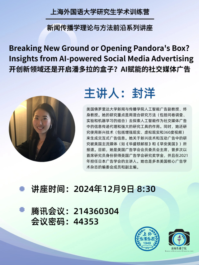 封洋,美国佛罗里达大学新闻与传播学院人工智能广告副教授、终身教授。她的研究重点是用混合研究方法(包括问卷调查、实验和机器学习的结合)去探索人工智能作为社交媒体广告中的信息传递代理和强大的研究工具的作用。同时,她还研究使用新兴技术(包括增强现实、虚拟现实和360度视频)来生成交互式广告信息。她关于新兴技术和互动广告中的研究被美国主流媒体(如《华盛顿邮报》和《早安美国》)所报道。目前,她是美国广告学会会员委员会主席,曾多次以首席研究员身份获得美国广告学会研究奖学金,并且在2021年担任日本广告学会的主讲人。她也是多本美国核心广告学术杂志的编委会成员和副主编。