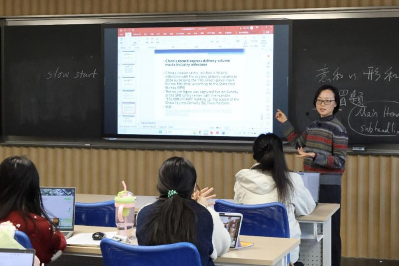 Liu Jia’s course is Advanced English News Writing and the demonstrative unit focused on a comparative study of Chinese and English news headlines and analyzed differences between Chinese and English headlines using recent sports news as examples. The class compared headline length, detail, sentence structure, and rhetorical strategies, and included translation exercises to enhance students’ understanding of audience awareness and cross-cultural communication.