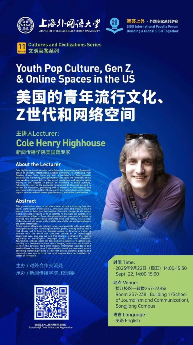 Cole Highhouse is an instructor in the School of Journalism and Communication at Shanghai International Studies University. He graduated from Bowling Green State University with a bachelor’s in Entertainment Business and Marketing. After graduation Cole spent the remainder of the year working various jobs in live event production and logistics while moving to Los Angeles to pursue an internship in music publicity. Following the start of the pandemic he returned to Ohio and decided to further his education, graduating with a master’s in International and Intercultural Communication. His research interests include social media, popular culture and soft power, popular music, and online communities.