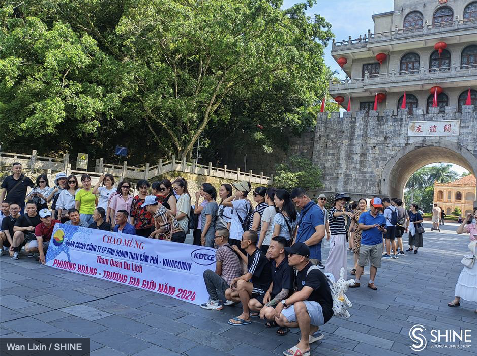 Vietnamese tourists pose for a picture at the Friendship Pass in Pingxiang.