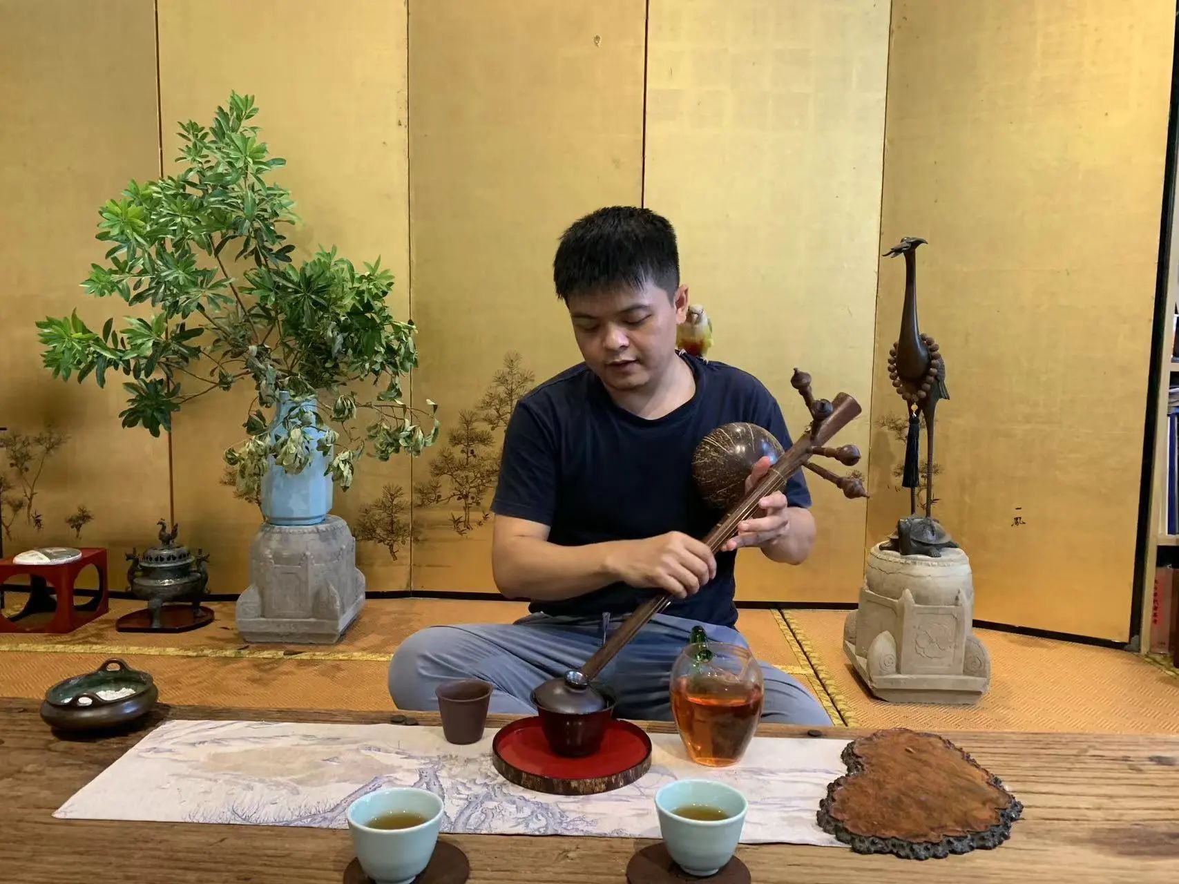 In his studio, several guqin zithers, a seven-stringed classical Chinese instrument, are placed on the bamboo-mat floor or the antiquity-style furniture, and a Thai folk instrument, the Pin Pia, hung on the wall, amid tea cups and a variety of tea pots.
