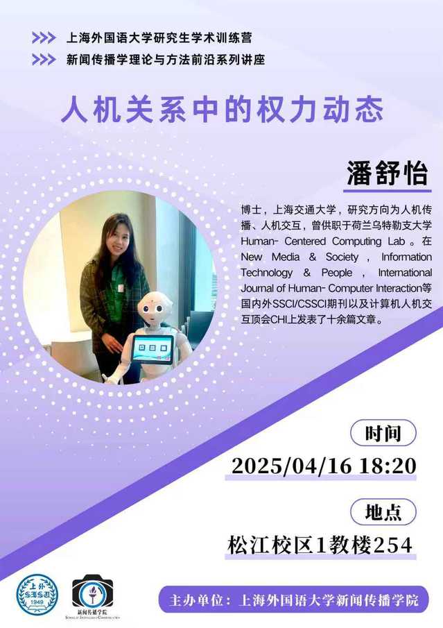 嘉宾:潘舒怡,博士,上海交通大学,研究方向为人机传播、人机交互,曾供职于荷兰乌特勒支大学Human- Centered Computing Lab。在New Media & Society,Information Technology & People,International Journal of Human- Computer Interaction等国内外SSCI/CSSCI期刊以及计算机人机交互顶会CHI上发表了十余篇文章。