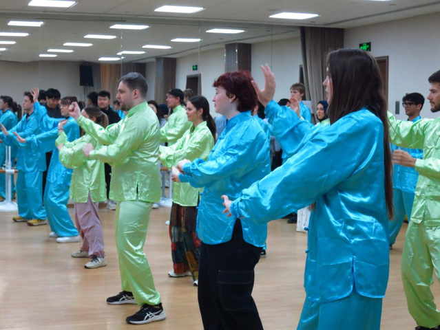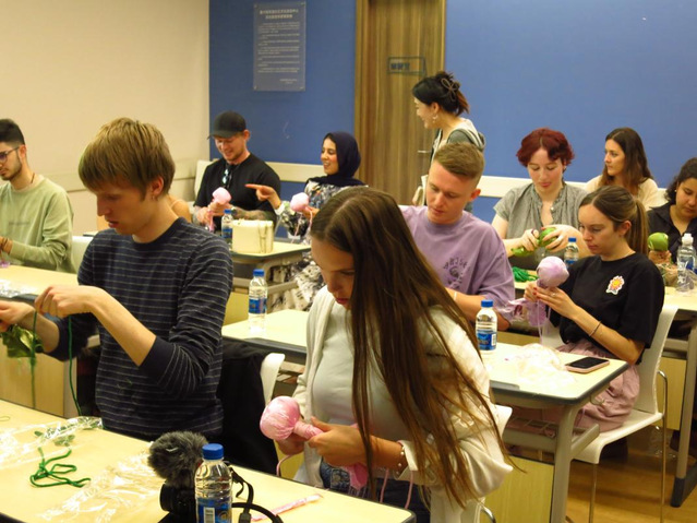 随后进行的非物质文化遗产深度体验环节,青年代表们在上海碳秘馆系统学习中国武术文化,并在非遗传承人指导下完成国风团扇创作。来自德国柏林的青年尼克在绘制水墨兰草图案后,郑重题写中文姓名留念。传统艾草锤制作课程则让各国青年在匠人示范中,亲身体验中医药文化与传统手工艺的智慧融合,来自加拿大的Hannah表示,她非常喜欢艾草锤上的丝绸图案。在“中国拳”场馆中,外国青年们则换上了绿色的太极服,在老师的指导下随着音乐一起打起了太极拳。