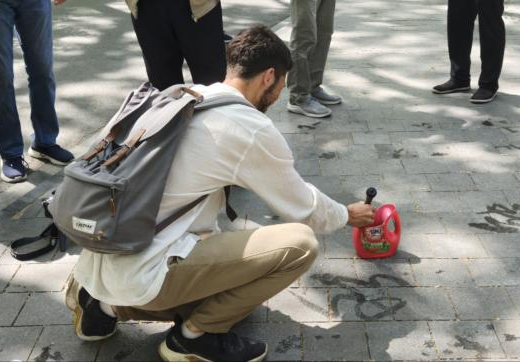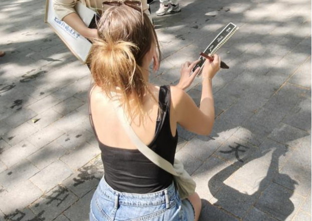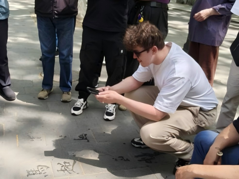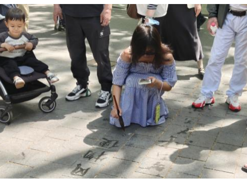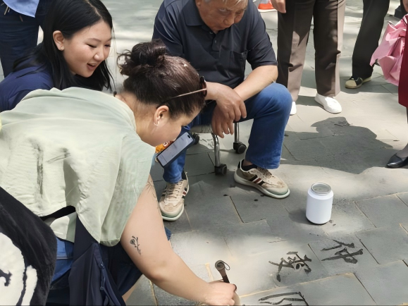 不一会儿,外国青年们的目光又被正在地上写字的“书法家”们吸引,青年们好奇地蹲下身,看见几位老人正用毛笔蘸水写字。Matthew接过老人递来的毛笔,在石板路上歪歪扭扭写下马超,并用中文自豪的说“这是我的中文名”,旁边的老人也夸赞道,“马超是历史上很著名的人物,你的中文very good!”越来越多的青年加入尝试,每一位朋友都认真的学习着中国书法,也不时比划手势询问运笔技巧。