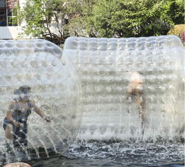 外国青年们首先踏入了鲁迅公园,目光被湖面的水上滚筒所吸引。Pol与Amelia满心好奇,随即在志愿者的陪同下进行了尝试。当滚筒开始缓缓转动时,他们紧紧抓住扶手,努力适应着这种全新的运动方式。随着滚筒转动速度的加快,他们开始在水面上翻滚,水花四溅,笑声和尖叫声此起彼伏。周围的游客也为他们加油鼓劲,整个场面充满了欢乐和活力。